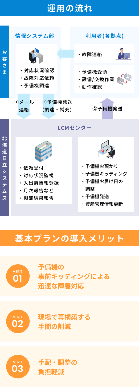 基本プランでは、予備機をキッティング後に指定場所へ発送します。お客さまにて受領頂き交換作業を実施願います。
